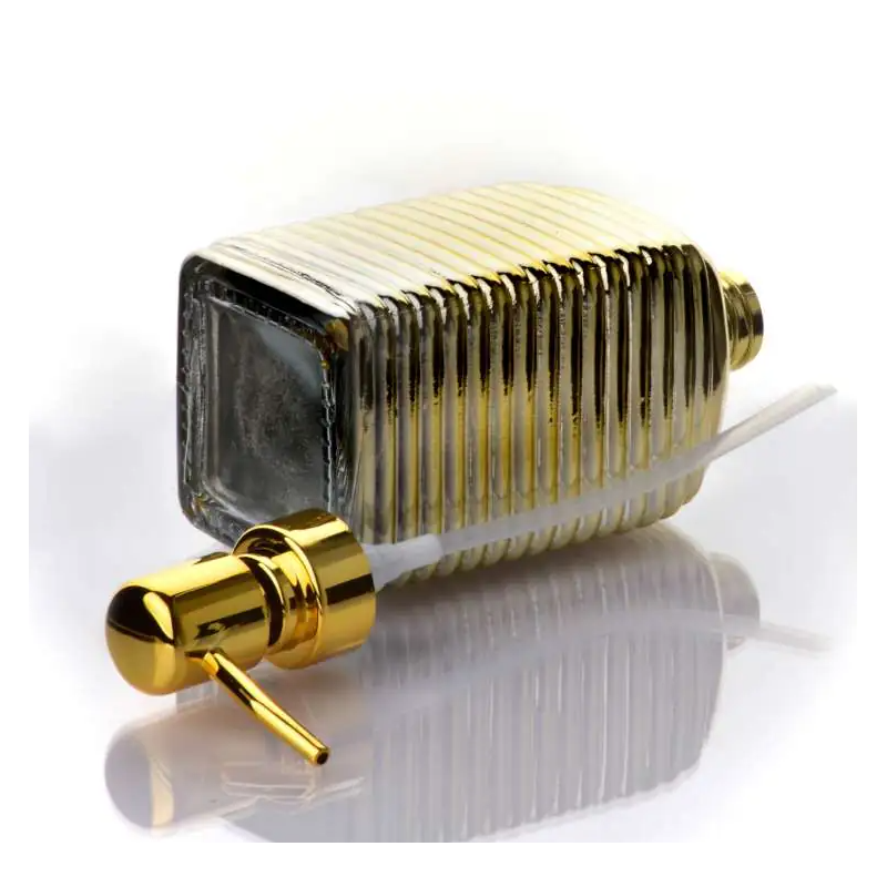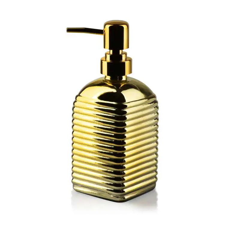 Szklany dozownik z serii TESSA marki BATHLAB by MONDEX w kolorze złotym.