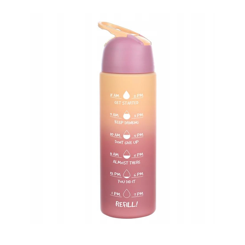 Motywacyjne oznaczenia: Butelka wyposażona jest w znaczniki czasowe, które pomagają monitorować ilość spożywanej wody w ciągu dnia, zachęcając do regularnego picia.